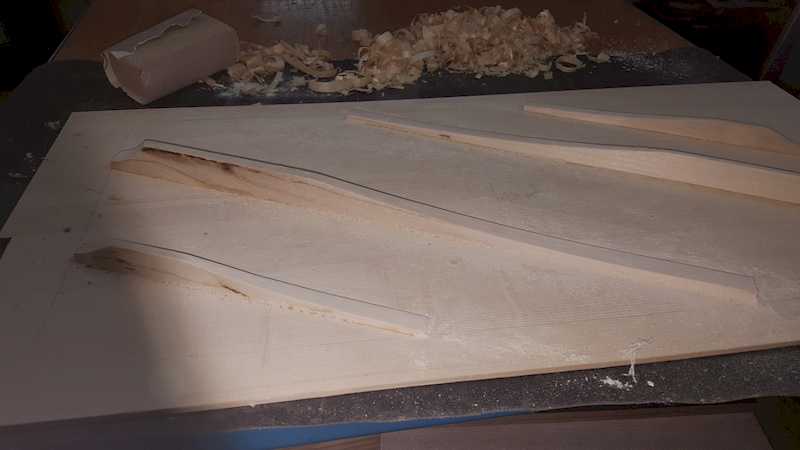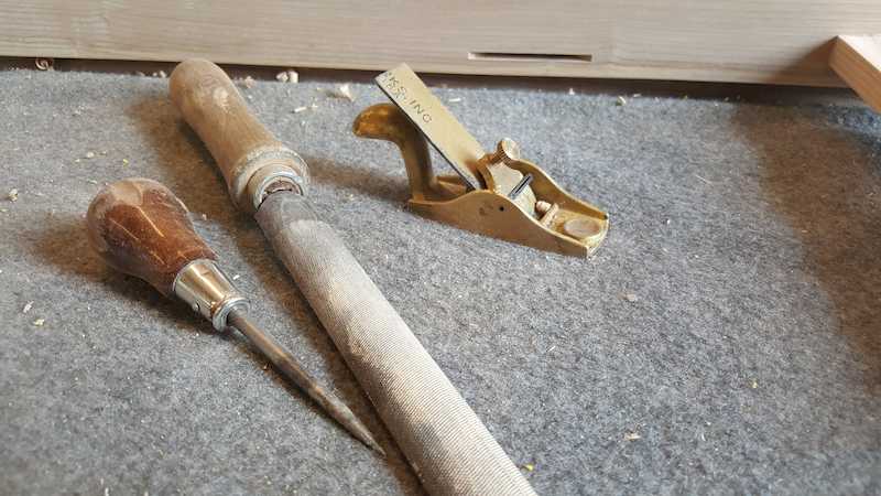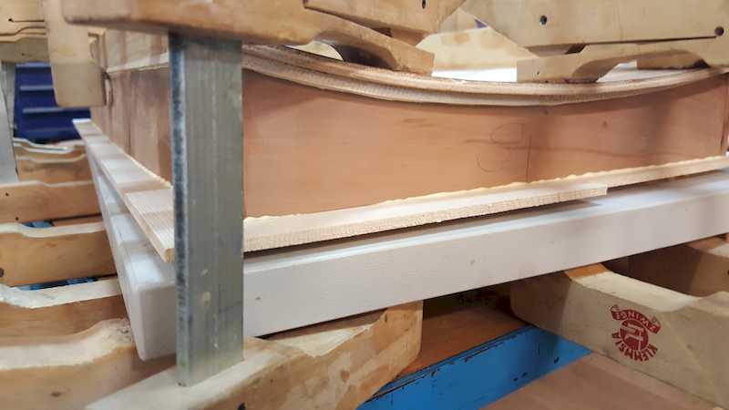 An der Deckelplatte werden Leisten angeleimt und mit dem kleinen Hobel abgeschrägt. Diese geben Stabilität und leiten den Klang weiter.