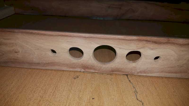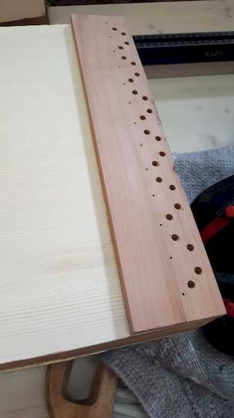 Die Leisten werden jetzt auf den Deckel des Monochords geleimt und nach einem bestimmten Muster gebohrt - große Löcher für die Saitenschrauben und kleine Löcher für die Saitennägel.